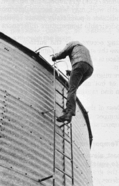 Observe grain by climbing into the bin. If you have filled the bin to the roof, sell or feed enough grain so you can safely get onto the grain surface. You're searching for small changes, indicators of problems to come. Check the surface for indications of crusting-wet, sticky or frozen grain. Observe the roof for evidence of present or past condensation. Thrust your arm into the grain and see if you can detect any heating. Grasp a handful of grain from arm depth and the surface, and smell for musty, moldy odors. Run the fan to smell exhaust air. Keep a small diameter, stiff rod, such as a long endgate rod with a loop for a handle, in each bin. Poke the rod into the mass, down the center, outward toward the sides. Feel for any hard, compacted or moist masses. Leave the rod thrust into the grain when you leave. Tie it to the roof! Withdraw it quickly next time you check the grain to feel if you can detect warmth. See the appendix for a summary of observations and corrective actions in managing grain.