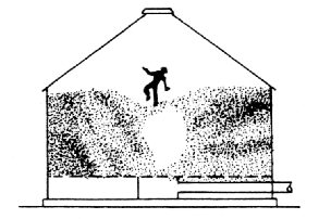 Peaking also makes it difficult and dangerous to enter the bin for observation. Because of dust and high temperatures during the summer, entering a small space between roof and grain should be prohibited. Shifting grain may block the exit.
