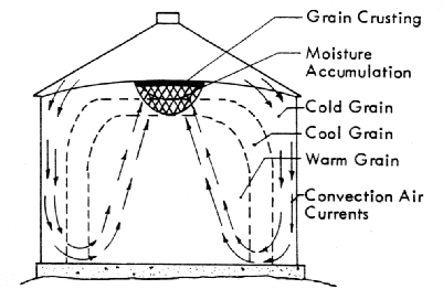 Convection currents develop because the grain and air near the bin walls cool. Cooling causes the air to become heavier and settle toward the bin floor. As the air moves toward the floor and then into the center of the bin, it becomes warmer and less dense or lighter. This causes the air to rise through the warm grain where it continues to increase in temperature. As the air increases in temperature, its moisture-holding capacity increases and it begins to absorb small amounts of moisture.