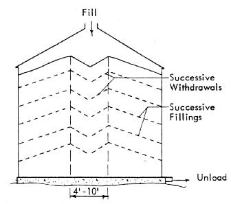 A secondary benefit of nondistributed filling is that the grain rolling down the cone of grain results in a looser fill than when using a grain distributor. This loose fill reduces the resistance to airflow through the grain. However, with nondistributed fines not removed by withdrawal, the aeration airflow patterns in the bin may not be uniform