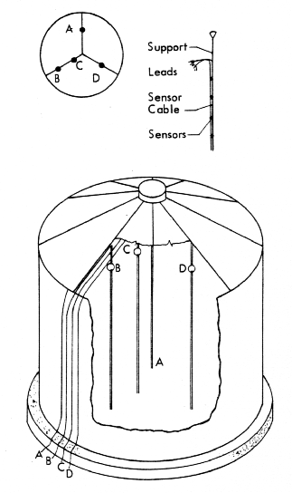 Consider installing temperature sensing units in large grain storages. Fig 6 illustrates locating four cables with temperature sensors 4'-5' apart along each cable. Suspend the cables from the roof. Mount the center cable to one side of the center of the bin to reduce the drag on the cable when unloading grain. Check with the bin manufacturer to be sure the cables, supports and roof can withstand the drag from grain filling and unloading. Anchor the bottom of the cables to assure alignment but allow for a sweep unloader. Bring the circuits from the top of the cables to a central point for attaching to the read-out device.