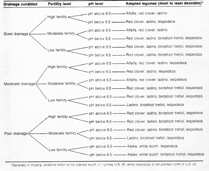 Primarily, three soil traits dictate what legume will likely grow best on hay and pasture land in Indiana. They are: drainage, fertility and pH (degree of acidity). Presented here is a procedure for selecting that legume species best suited to a field based on its particular combination of these three soil traits.