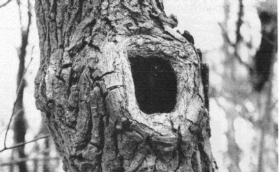 Cavity trees are living trees which have internal cavities. These cavities are created by injury, disease, woodpeckers, or loss of large limbs. The best cavity trees have healthy crowns, a cavity protected from rain, and may provide multiple benefits, including multiple dens and mast production, or contain woodpecker nests on large dead limbs. Because of the long time period required to produce a cavity tree, both existing and potential cavity trees with healthy crowns should be retained through any rotation to provide adequate den sites while a new stand is developing. Actively used cavities can be identified by smoothly worn entrance holes (bird nest), fresh gnawing around the entrance (mammal den), or observation of wildlife use. These should be retained, and additional trees with cavity potential may be left to achieve your objective. Cavities usually occur in tree crowns and may affect less than 20 percent of total hoard foot volume.