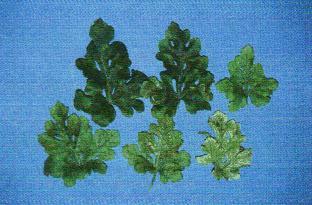 The injury on the watermelon leaves consists of premature chlorosis (yellowing) of the upper surface of the older foliage (Figure 2). The foliage later becomes necrotic (brown or black) (Figure 3), with white spotty patches within the necrotic areas (Figure 4). Ozone injury on muskmelon is similar, except that foliar discoloration on the upper areas goes directly from yellow (Figure 5) to bleached white (Figure 6).