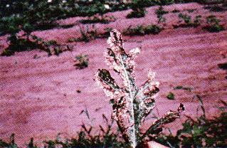 The injury pattern on the foliage is initially observed on older mature leaves near the crown or center of the plant, often progressing with time to the younger, more vigorous foliage. The yellowing of the plant centers in rows of watermelons is quite distinct and can give fields a visibly striped pattern of alternating yellow and green bands (Figure 7). In other states, this type of injury on watermelon has been descriptively referred to as "center of the crown dieback." In contrast, injury on muskmelons is typically much less severe and is visible at a later stage of plant development. Air pollution-induced injury on watermelons and muskmelons has been experimentally verified in the laboratory.