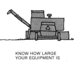 Know the position of parts that extend beyond or above the header, such as the unloading auger, cab, grain elevator or exhaust pipe. Know just how large your equipment is This will help avoid hitting fences, buildings, power lines, trees, etc. Visibility to the rear is usually limited. Make sure everything and everyone is clear before backing or turning the combine.