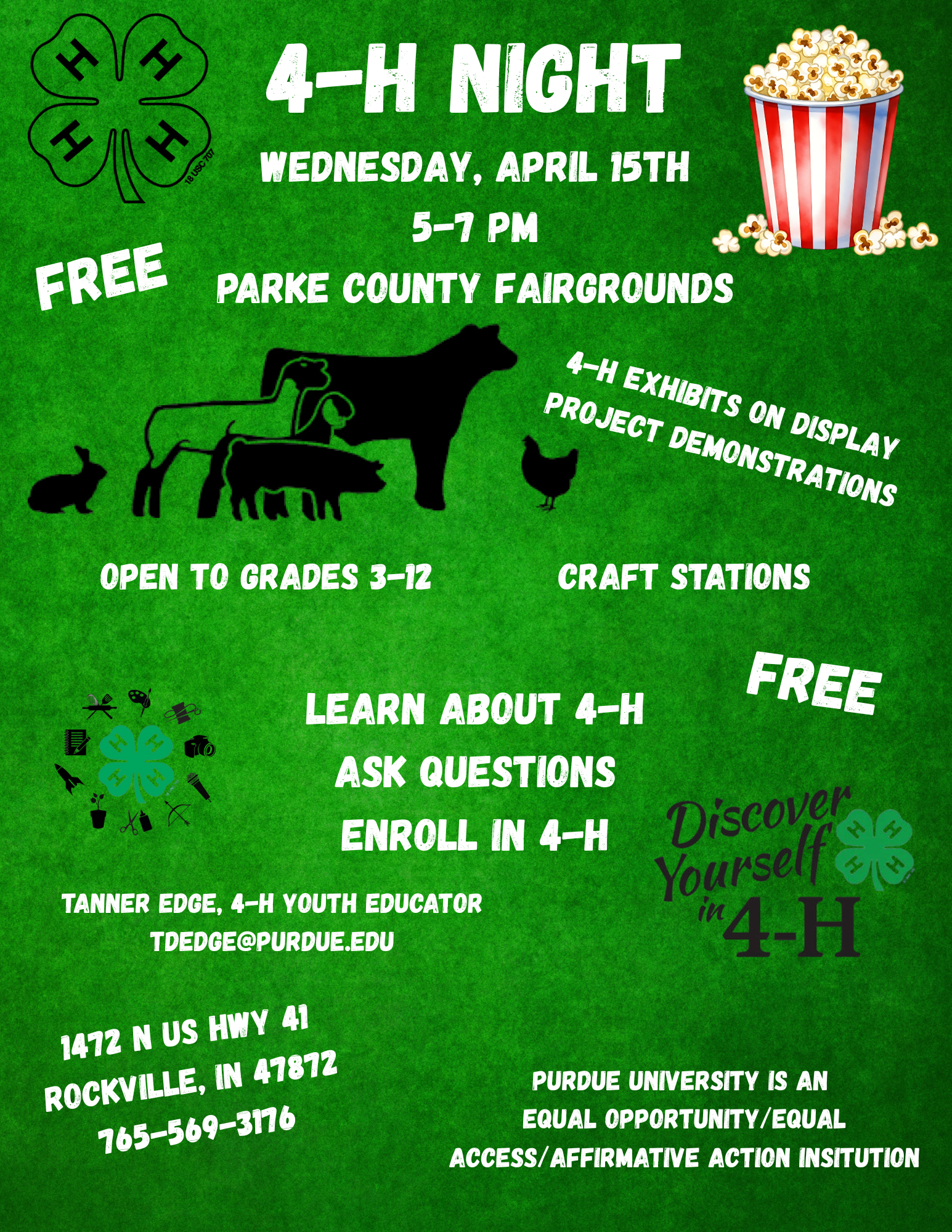 4-H Youth Educator: Tanner Edge, tdedge@purdue.edu 765-569-3176